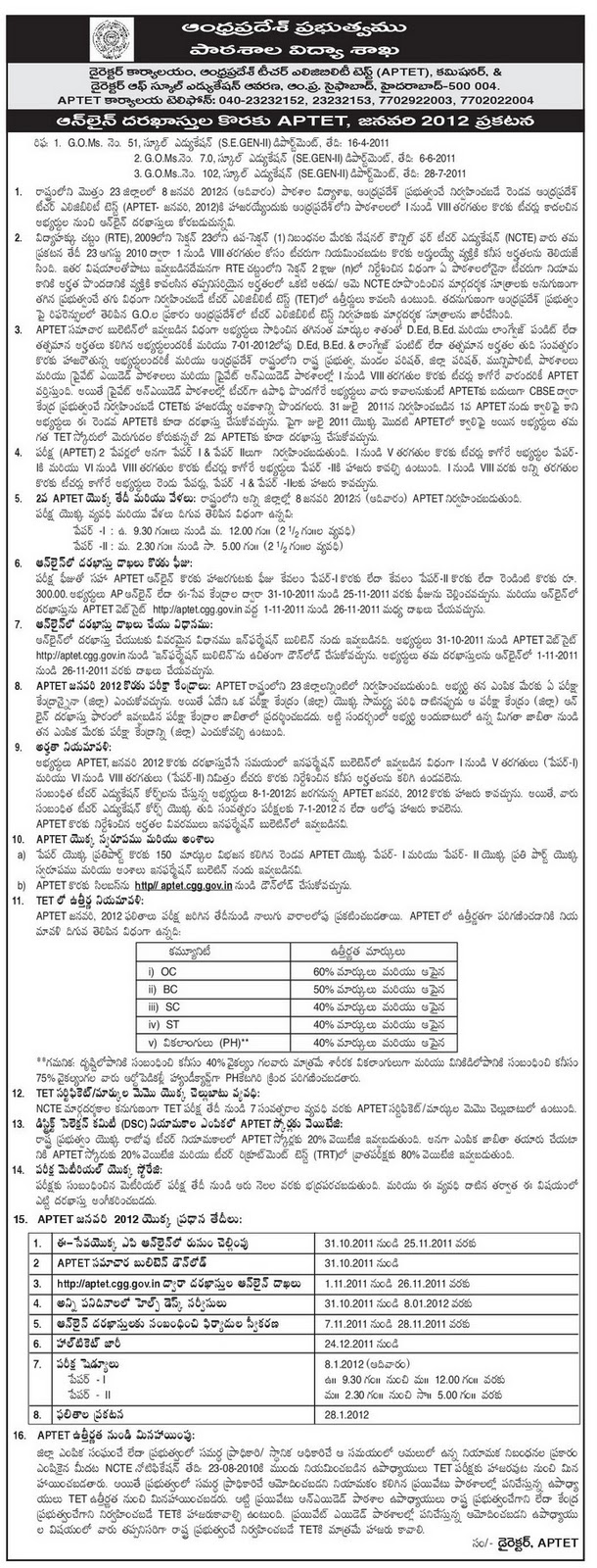 APTET-2012 (JANUARY) NOTIFICATION RELEASED